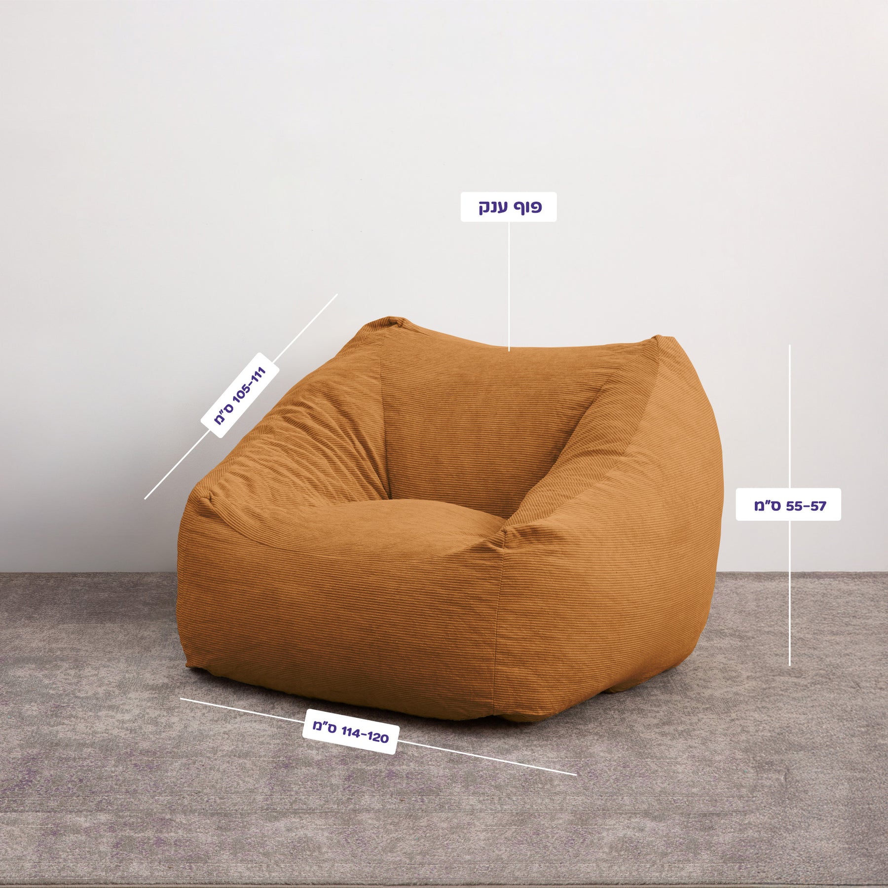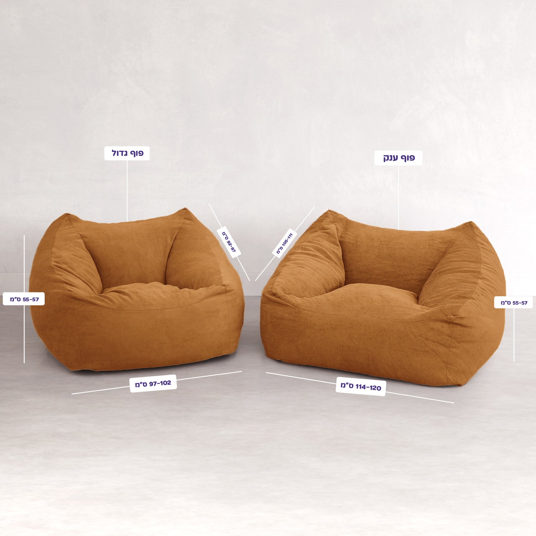 לפוף שלנו 2 גדלים לבחירה - גדול או ענק ולשניהם מילוי מפנק של פתיתי ויסקו רכים ונעימים (לא קלקר) שמתאימים את עצמם לצורת הגוף של מי שיושב עליה ומספקים תמיכה מושלמת ותחושה של ריחוף על ענן, כך שלא תרצו לקום ממנה!